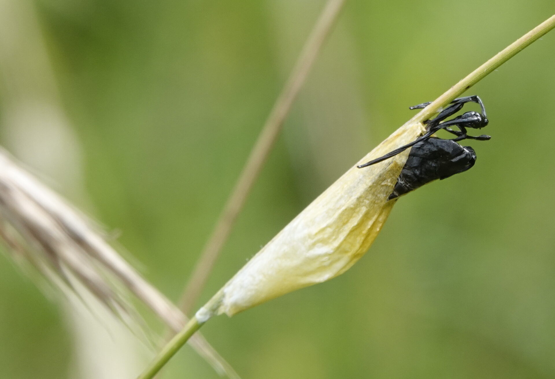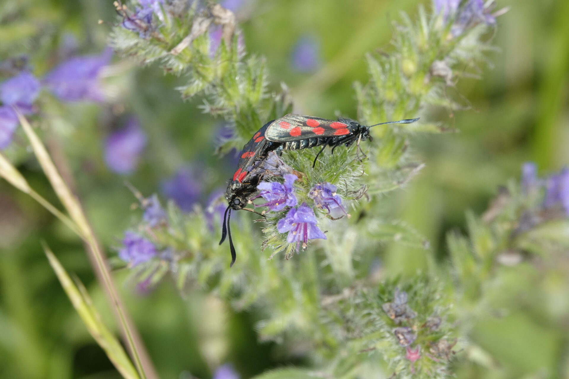 There were also a pair of these six spot burnet moths, which are day flying moths. If you look carefully you may see one emerging from a cocoon on a blade of grass.
